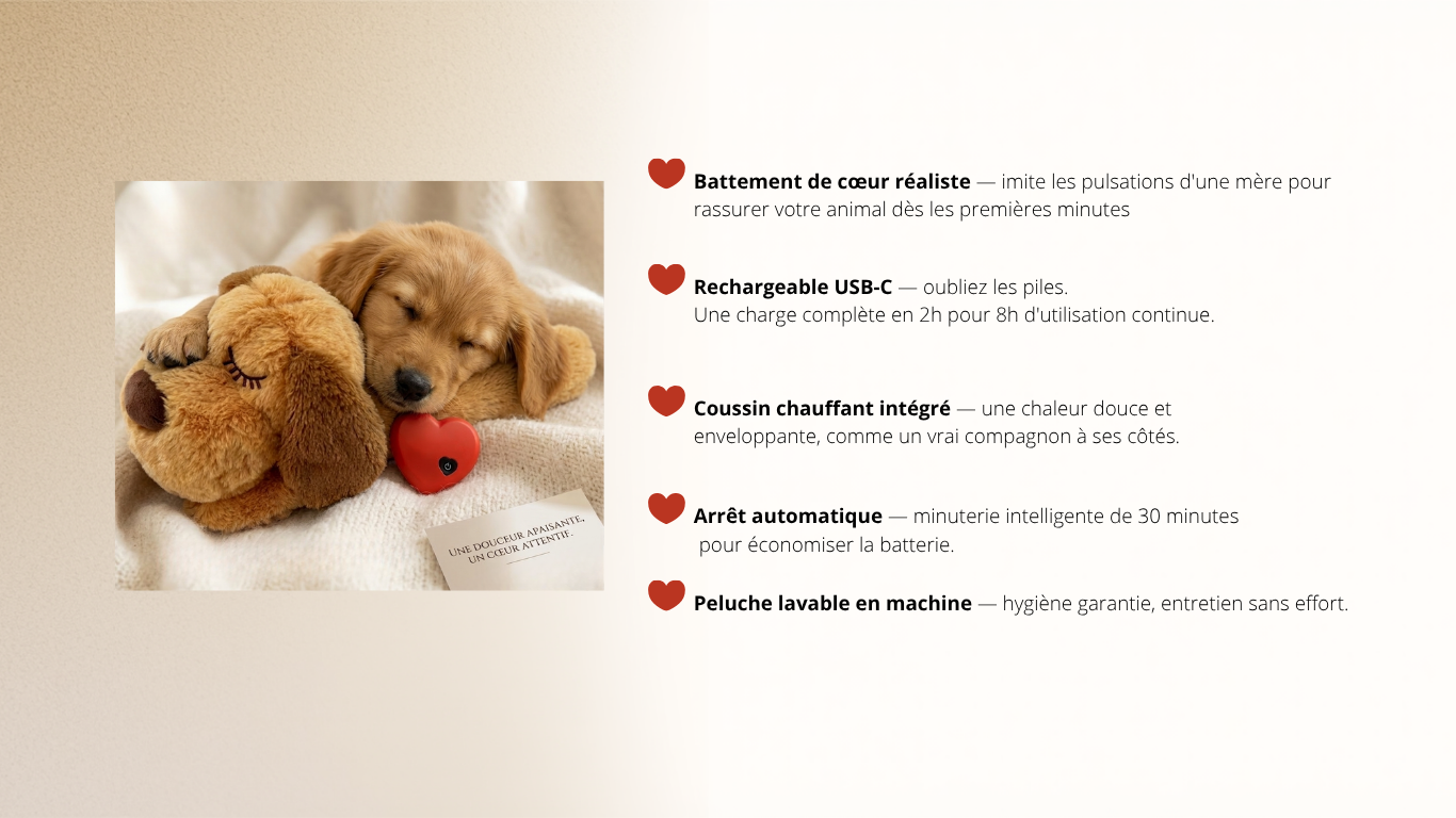 - Apaisez : Regardez votre animal s'endormir paisiblement au rythme des battements.